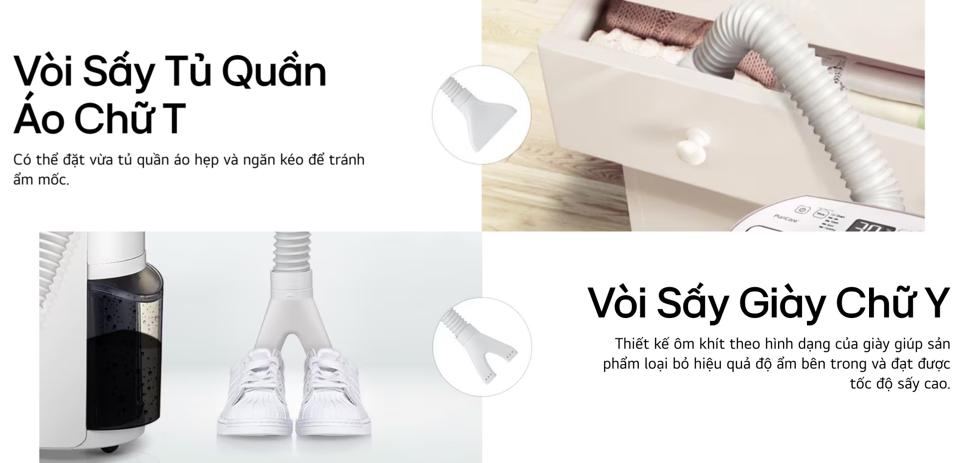 Chế Độ Hút Ẩm Quần Áo và Giày Dép: Máy đi kèm phụ kiện hỗ trợ hút ẩm cho quần áo và giày dép, đặc biệt hữu ích trong mùa mưa ẩm.